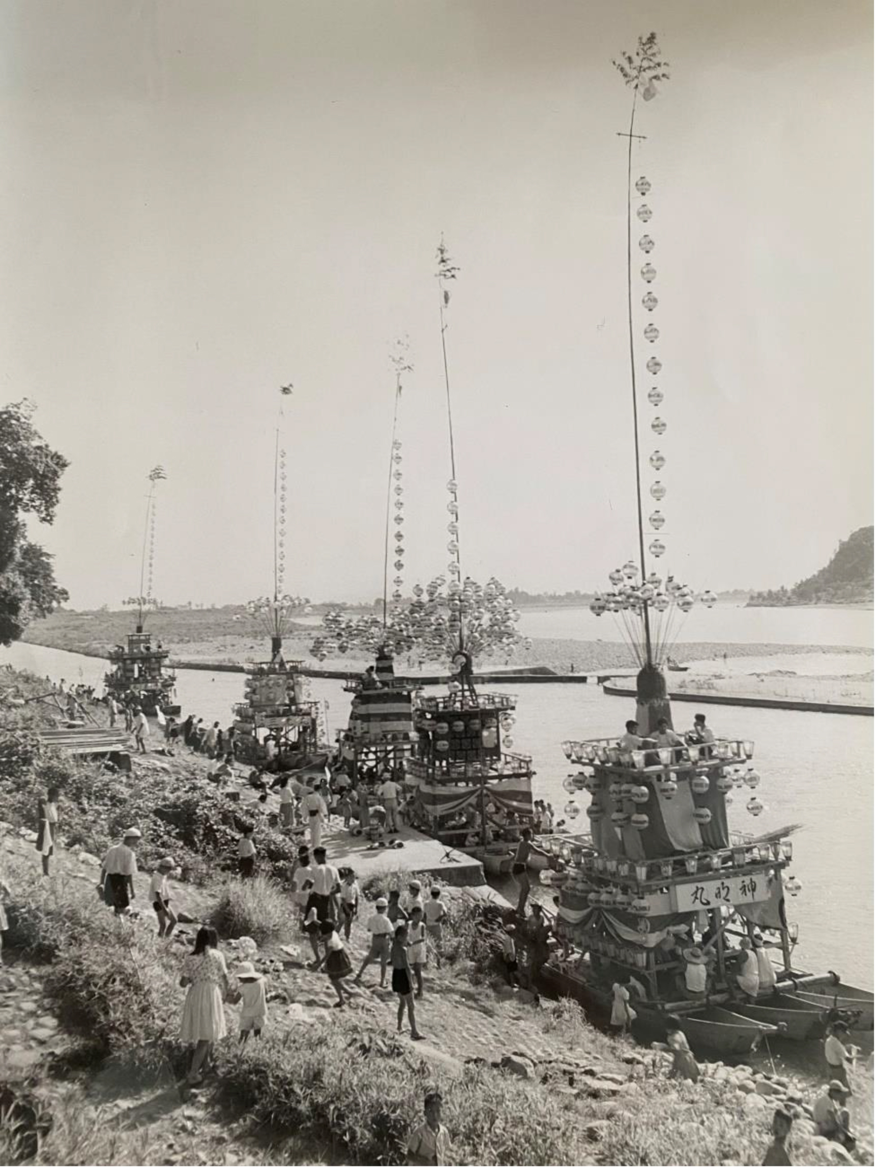 犬山川祭は、犬山城の丸の内に鎮座する三光稲荷神社の神賑(かみにぎわい)行事として、毎年7月22日(旧暦6月22日)に行われていました。しかし、昭和30年代半ば、犬山頭首工(ライン大橋)の建設をきっかけに、その姿は川面から消えてしまいました。