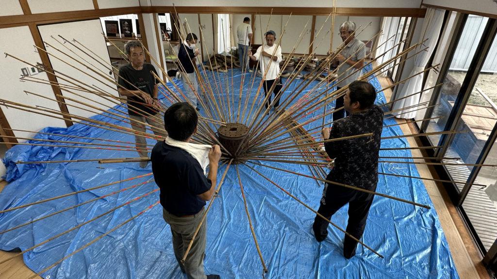 「豊光丸」蜂の巣提灯飾り付け要領確認~犬山西ふれあいセンター~ 2025/10/19(日) 活動報告 2025-10-22 「豊光丸」の巻藁部分に使用する蜂の巣、提灯、それを下げる竿の状態確認を行いました。悪天候のため、急遽屋内施設を手配して移動、安心して作業することができました。提灯は使えるもの、使えないものを選別して数を確認。蜂の巣には天井に当たらないところまで竿を差し、先端の提灯を下げる掛け具をチェックして、無いものには新たに取り付けました。作業の結果、丸提灯が蜂の巣用60個を含めて90個、弓張提灯14個、堂島提灯2個の不足が判明し、新規調達が必須となりました。