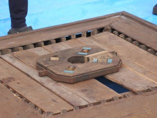 第3回倉出し~材木町神社~ 2020/10/18 活動報告 2025-05-302025-06-11 第3回倉出し~材木町神社~ 今回は、巻藁提灯の土台となる蜂巣(はちのす)の構造と、真柱(まばしら)に13個の提灯を掲げる縄梯子(なわばしご)の調査です。蜂巣は屋根上の台板にローラーのついた回転台を置き、その上に真柱が貫通する穴を合わせて設置します。長い鉄棒のついた締め金具を取り付け、屋根の外側から回転させます。真柱の提灯用縄梯子は最初は使い方がまったく分かりませんでしたが、現物を合わせながら試行錯誤するうちに、提灯を揚げる仕組みを理解できました。