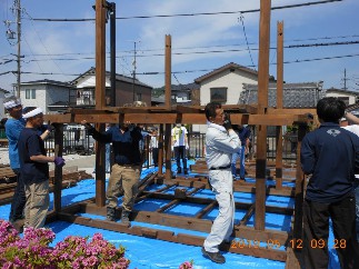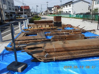 材木町のお宮の倉庫から、消滅していた川祭の巻藁船の部材が出てきました! この発見を機に、町内の有志を中心に「犬山川祭保存会」が発足。この日は、すべての部材を倉庫から出して保存状態を確認するとともに、櫓を組み立て、その構造の調査を行いました。見たこともないものを組み立てるわけですから、困難を極めることを予測していましたが、犬山祭の車山(やま)組みのノウハウを持つ人たちが助っ人に現れ、町内の長老方のアドバイスも受けながら、何とか無事に組み上げることができました。