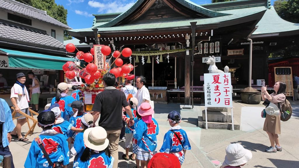 川祭は、犬山城のすぐ近くに鎮座する三光稲荷神社の祭礼として始まりました。三光稲荷神社は、もともと犬山城主が崇敬した神社で、もとは犬山城内にありましたが、明治時代初期に三光寺山(三狐寺山)へ遷座され、その後、現在の犬山城登り口の近くへ移転しました。 三光稲荷神社の祭礼は、五穀豊穣や地域の繁栄、無病息災を祈る神事として行われ、そこに町民が参加する祭として「川祭」が生まれたと考えられています。これは、春の犬山祭が陸上の車山を曳く祭であるのに対し、川祭は夏に川を舞台にして、船上の車山を運航する形で発展しました。